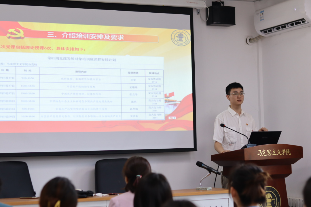 21级硕士生党支部书记谢鑫辉向大家介绍了本次党课培训的课程和时间安排,强调党课培训过程中要严格遵守纪律,通过严密组织和积极推进,进一步做好对发展对象的管理和培养工作。