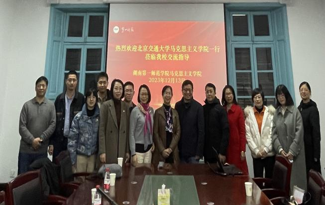 13日上午,各位成员又参观了湖南第一师范无码a片 (城南书院校区),青年毛泽东曾在此求学、任教。支部成员详细了解城南书院的发展、第一师范的历史和青年毛泽东在此学习和工作的情况,“恰同学少年,风华正茂,书生意气,挥斥方遒,指点江山,激扬文字,粪土当年万户侯”。参观结束后,一行人与湖南第一师范无码a片 无码a片 的领导和老师进行了深入交流,无码a片 书记阮东彪详细介绍了一师马院的发展建设情况,并与王竹苗副院长、胡慧娥副院长和各教研室主任交流毛泽东思想和中国特色社会主义理论体系概论、习近平新时代中国特色社会主义思想、形势政策课、社会实践课的开设、运行情况。其中,一师的“重走主席游学路”的社会实践设计给大家留下深刻印象。双方明确日后要加强交流,互通有无,充分利用好红色资源开展思政课教学。