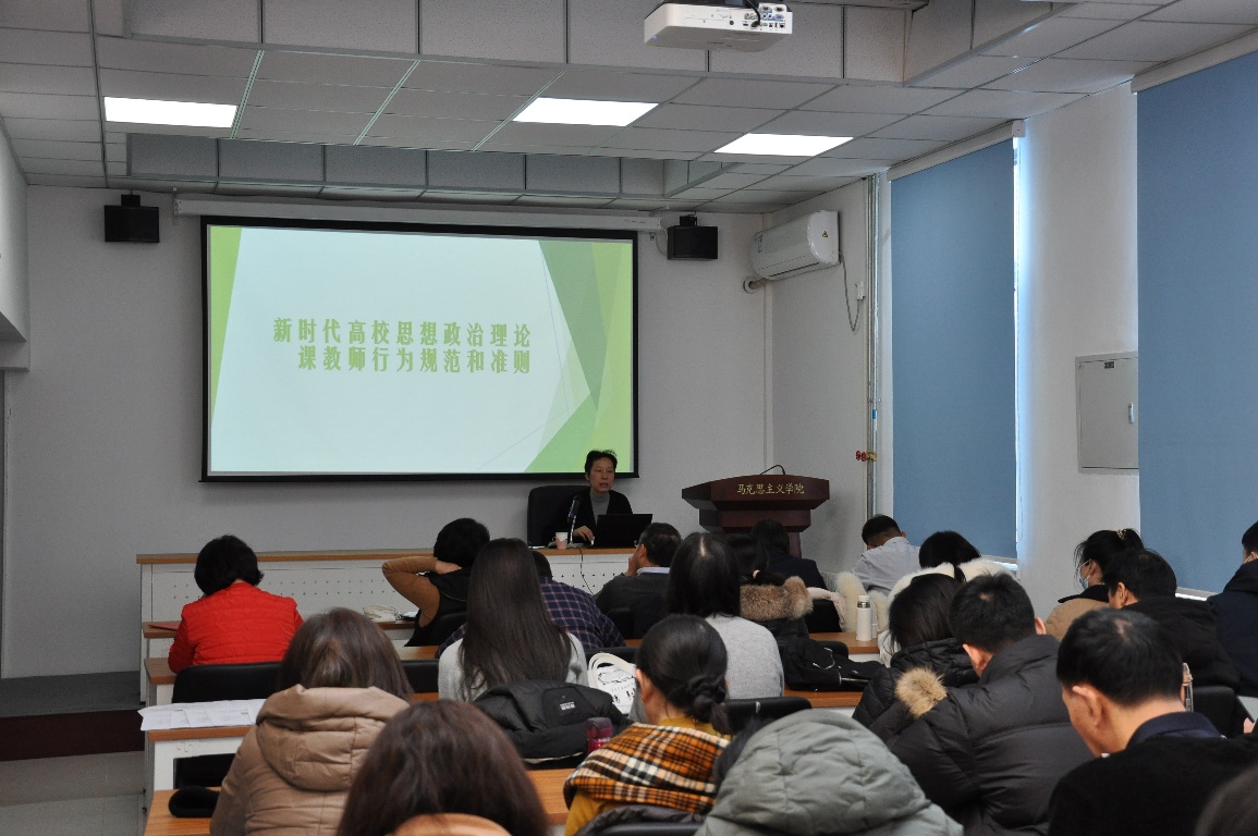 无码a片 党委书记孙冬梅为无码a片 教职工讲解了《新时代高校思想政治理论课教师行为规范和准则》,重点对照文件中十二条规范进行解读。孙冬梅表示马院教师要保持清醒头脑、遵规守纪;要修身立德、潜心育人,模范践行教育家精神,真正成为“经师”与“人师”相统一的“大先生”。