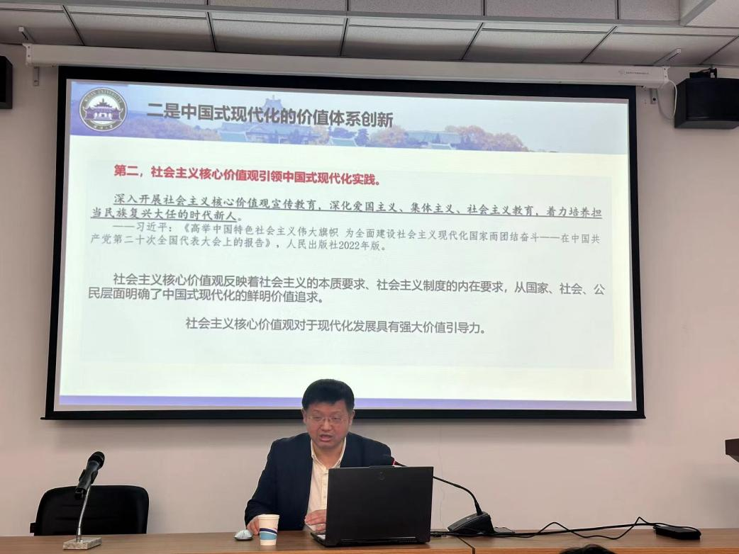 项久雨教授从中国式现代化是二十大的重大理论创新、中国式现代化的三大体系创新、中国式现代化创新的未来展望三个方面进行了详细阐述。首先,项久雨教授指出,党的二十大初步构建了中国式现代化的理论体系,并从政治基础、道路方向、主体力量、内生动力、精神支撑等方面重点阐释了中国式现代化全面推进中华民族伟大复兴必须牢牢把握的五个重大原则。随后,项久雨教授从知识体系创新、价值体系创新、制度体系创新等角度深入探讨了中国式现代化的三大体系创新,认为三大体系是相辅相成、不可分割的关系,共同展现出中国式现代化的伟大创造。最后,项久雨教授针对“中国式现代化创新的未来展望”这一问题表达见解,认为要重思人与物的关系、人与国家的关系、人与自我的关系、人与社会的关系、人与自然的关系、人与制度的关系、文明与文明的交往关系,加强建设美好世界、发展美好国家、构建美好社会和创造美好生活,实现以中国式现代化全面推进中华民族伟大复兴。